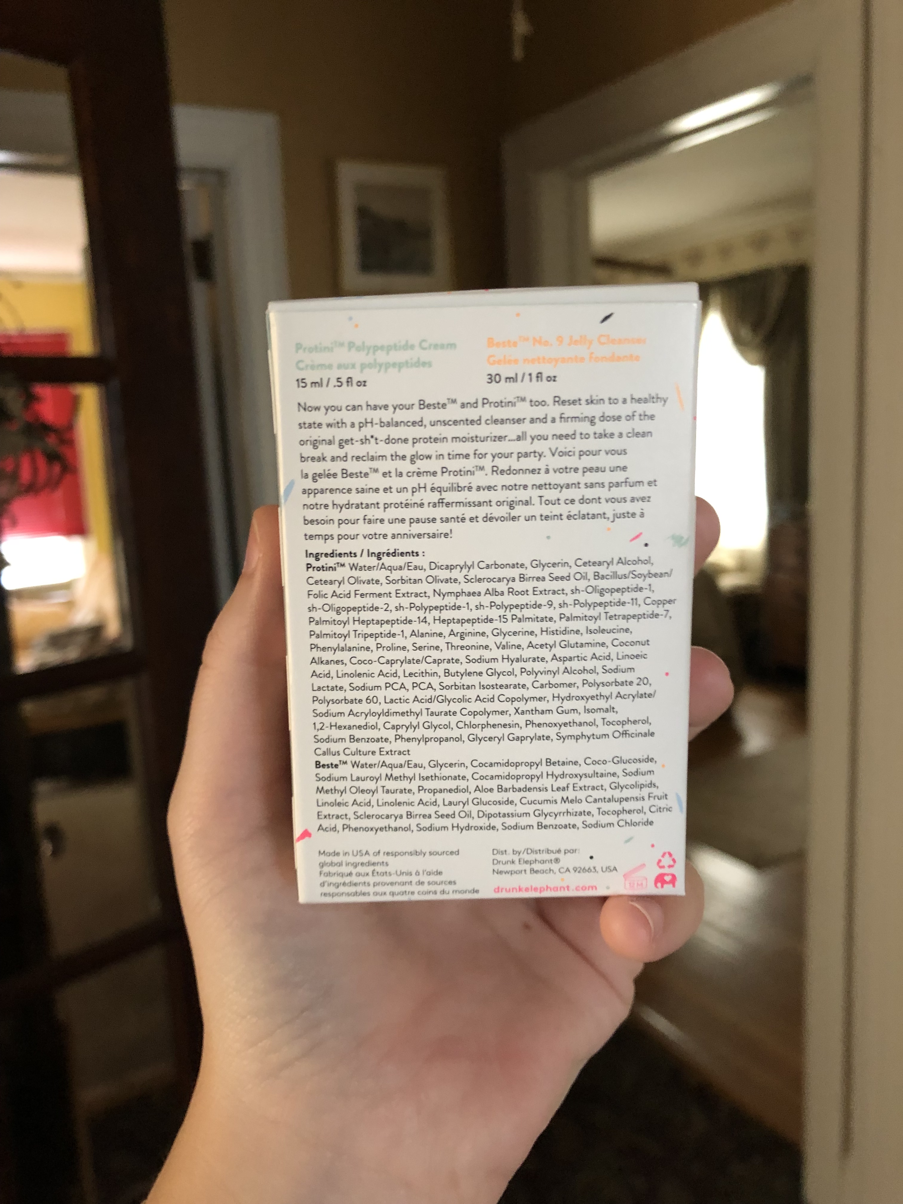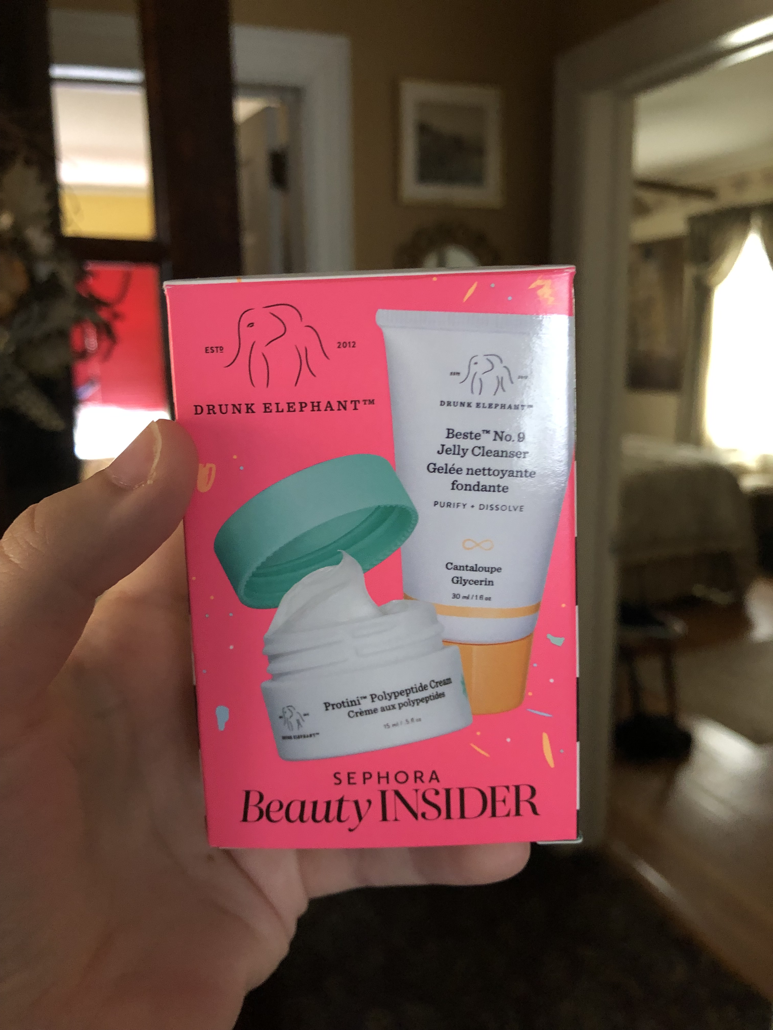 Good evening everyone! It’s been quite the week – I hope yours went well. For tonight, I thought I would share a little free gift that I received from Sephora for my birthday. If you sign up with the website and make an account, you’re eligible to receive a birthday gift every single year. It’s a great way to test out new products and see what you like! For 2019, Sephora is offering their Beauty Insiders the choice between a Kat Von D sample set of three shades of her Studded Kiss lipstick, a powder, a Tattoo liquid eyeliner and Drunk Elephant’s sample sizes of their Protini Polypeptide Cream and Beste No. 9 Jelly Cleanser. I decided to get the Drunk Elephant gift because I am obsessed with their products and it was a perfect way for me to test out some of their other items that I had never tried prior.