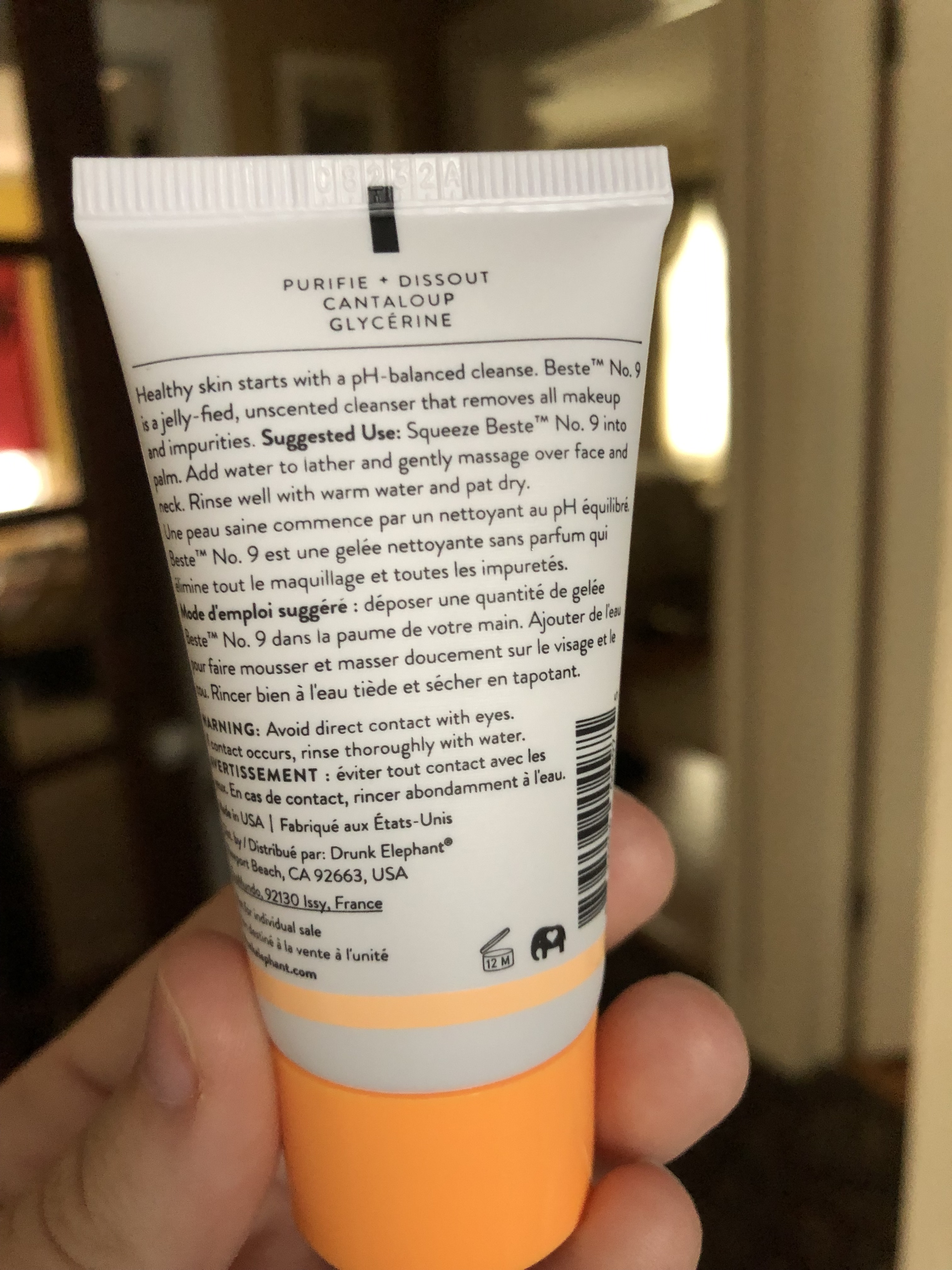 Getting into the first product you see when opening up the box, we have Drunk Elephant’s Beste No. 9 Jelly Cleanser. I wasn’t sure at first if I would like this product since I was nervous about the texture, but I do love this item. It foams up very easily in the palms of your hands when you mix it with water and is very gentle on the skin. This product is also recommended for use if you’d want to take your makeup off after wearing it all day. Another big plus for me is that it has no scent. I’ve been using this for a little bit now, so I can’t exactly tell you if it has improved my skin, but it does make it feel baby soft after I rise my face with it. Once again, the bright coloring of the orange against the white on this product is very aesthetically pleasing, in my opinion.